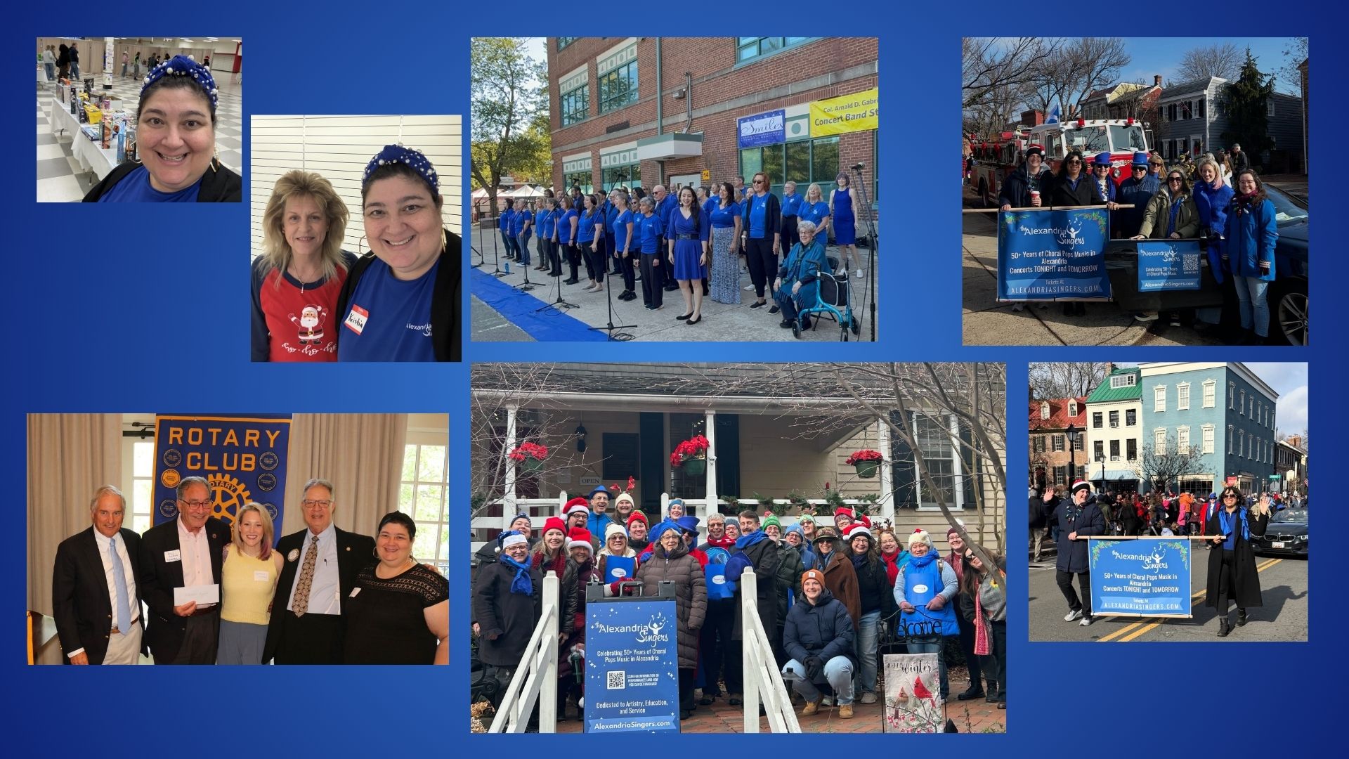 The Alexandria Singers around town: Performing at Art on the Avenue, Volunteering at Volunteer Alexandria Toy Drive, Marching in the Scottish Christmas Walk Parade, Caroling around Old Town, and Receiving our Grant from the Rotary Club of Alexandria.